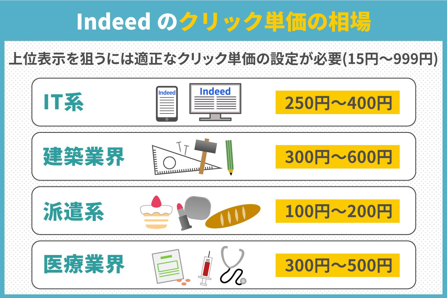 Indeed広告は、業界ごとにクリック単価が異なりますし、Indeedの広告代理店によっても設定する単価設定は違うので、極端に言ってしまうと業界の単価相場に合わせる必要はありません。もともと、Indeedではクリック単価を15円から999円まで設定することができますので、細く長く求人募集をしたいという企業であれば最低ラインの単価でも掲載可能です。