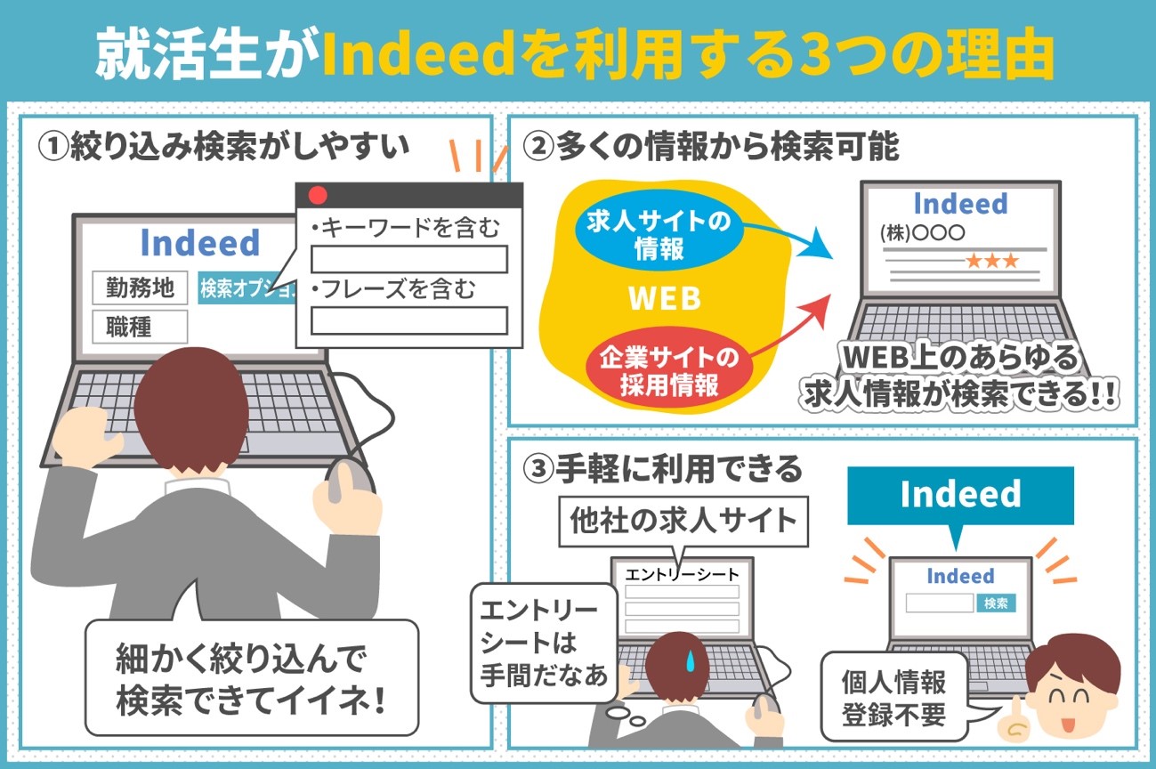 Indeedは、新卒就活生向けの求人サイトとは異なる「求人検索サイト」です。ほかの求人サイトを含め、ウェブに掲載されているあらゆる求人情報から、希望の職種や勤務地などにマッチしたものを表示するシステムです。Indeedだけであらゆる情報から検索できることも、忙しい就活生に重宝される理由といえます。